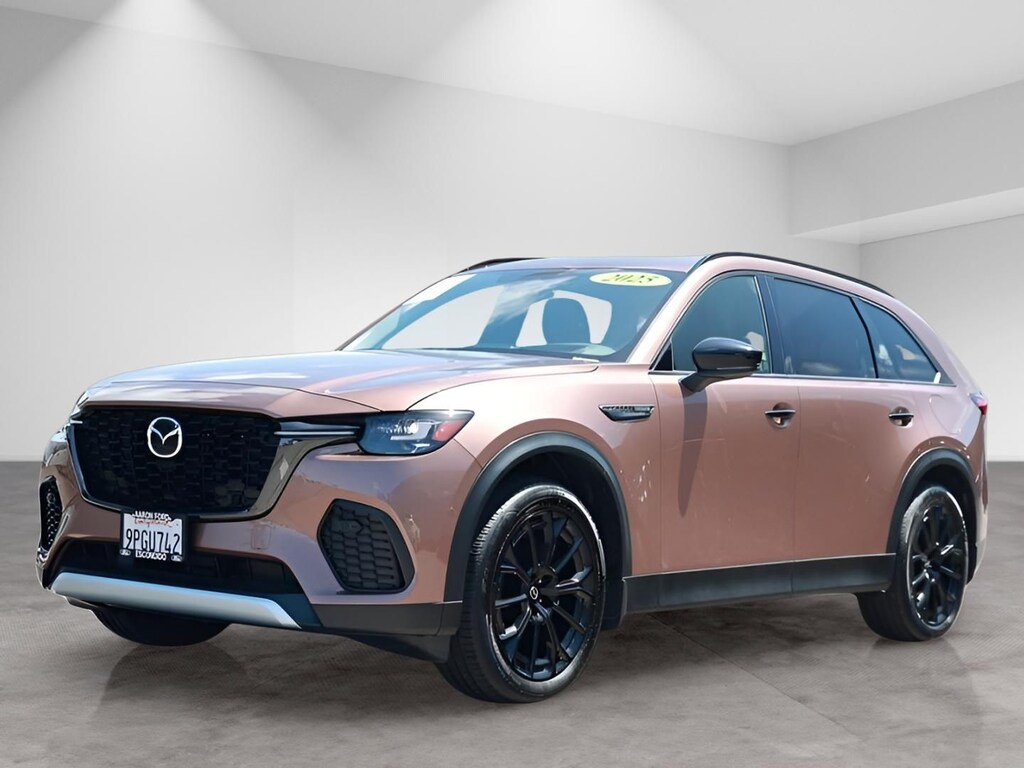 2025 Mazda CX 70 3.3 Turbo Premium Package AWD. Melting Copper Metallic over Black. Only about three thousand two hundred miles. One owner. Personal lease history. California vehicle. No accidents reported on CARFAX. Serviced and safety inspected with dealer records on file. Confident, quiet, and quick with the smooth inline six turbo and standard all wheel drive. Roomy two row layout with smart storage and an upscale cabin that still feels new. This is the color you notice in the parking lot and it looks fantastic in person. VIN JM3KJDHD4S1116004.